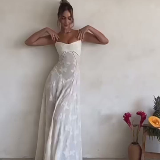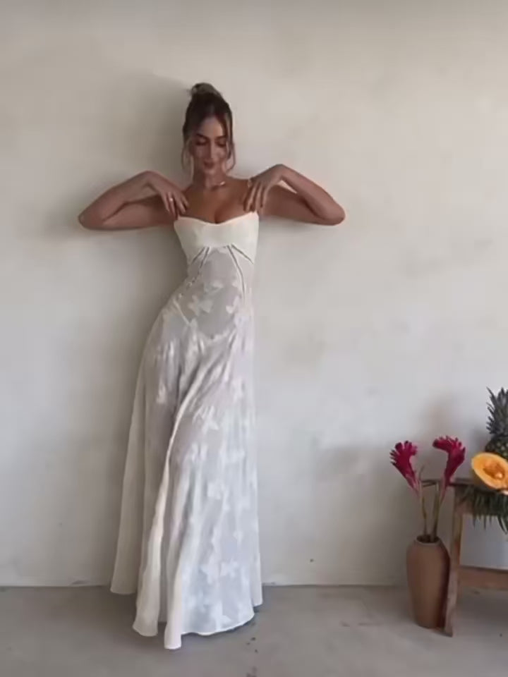 A romantic maxi made for golden-hour walks and dressed-up summer nights. The fitted bodice highlights your shape while the soft, flowy skirt moves effortlessly with every step. Subtle textured florals catch the light for an elevated, timeless finish. Elegant, feminine, and crafted for moments worth remembering.